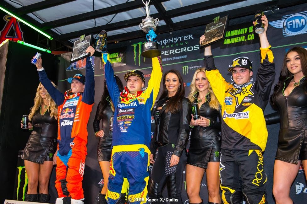 Svůj první závod ve třídě 450SX vyhrává Anderson na Husqvarně, druhý je Dungey, třetí Seely, čtvrtý Tomac a pátý Roczen i po nevydařeném startu. Tohle byl neuvěřitelný závod, skoro jsem nestíhal sledovat, co se děje a ještě to nějak zaznamenávat! Tahle třída je jednoduše neuvěřitelně nabitá a doufám, že podobně bude vypadat většina sezóny. Taky doufám, že JS7 bude OK. Zdá se mi, že se umí zranit i při nevinně vypadajícím pádu.